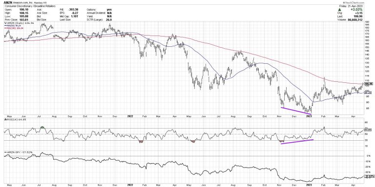 Amazon (AMZN) broke down through its 200-day moving average in December 2021, after testing this long-term barometer as support numerous times earlier that year. Rallies in May 2022, August 2022, and February 2023 all failed right at the 200-day moving average.