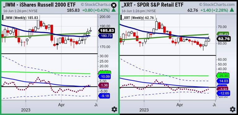 Granddad and Grandma Russell and Retail are the matriarch and patriarch of the Family. IWM cleared the 50- and 200-week moving averages and is in an accumulation phase. 190 remains an elusive point to clear (the 23-month moving average not seen here is key).