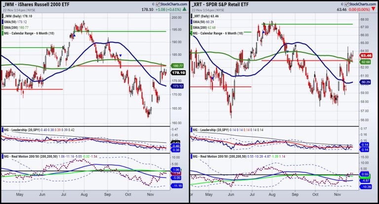 Beginning with our patriarch and matriarch, we see 2 different phases, similarities in leadership and divergent momentum. The Russell 2000 (IWM) is in a recovery or recuperation phase, trailing behind the SPY. Its momentum matches the price movement; both momo and price are struggling to clear key resistance. Furthermore, Granddad remains under the July 6-month calendar range low, certainly not a bullish sign. Gramps’ holiday leans more to underscoring the market madness we see in NASDAQ.