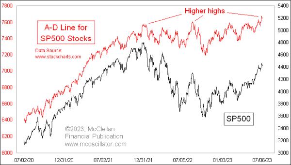 CHART 2: DAILY CHART OF THE S&P 500 INDEX. The index is trading well above its 50-, 100-, and 200-day moving averages. The percentage of stocks trading above their 200-day SMA is trending higher but declines are greater than advances. Chart source: StockCharts.com (click on chart for live version). For educational purposes.