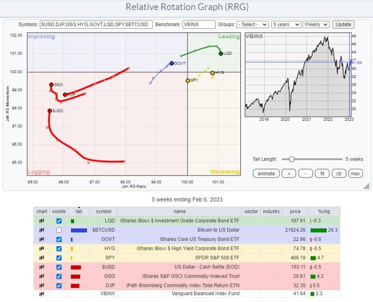 Looking at the current state of Asset Class rotation, we find the tails for commodities inside the lagging quadrant, with GSG picking up relative momentum recently. The relative trend for this asset class remains down and is, therefore, less interesting for investments, as stocks and bonds (our VBINX benchmark) are doing much better now.