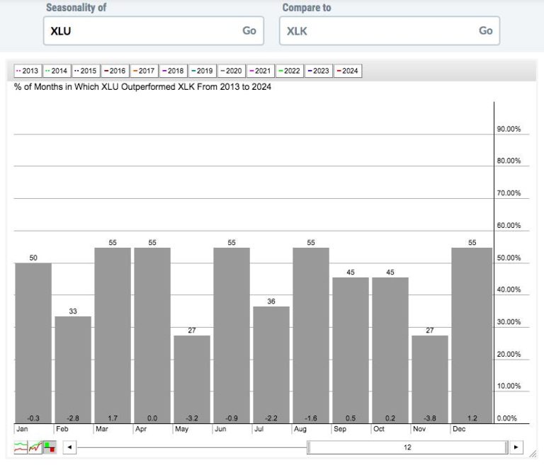 Utilities don’t outperform technology very often, but it seems to happen somewhat frequently in the 3rd months of calendar quarters. Check out March, June, September, and December above. March is the best calendar month for XLU outperformance vs. the XLK. But the second months, February, May, August, and November, favor technology in a HUGE way!