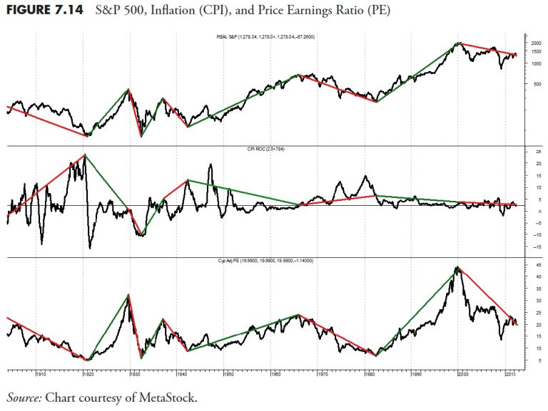 The first part of the book is a lesson in market finance and economics from a practitioner view and not the usual financial academic approach — again quite informative and refreshing. Every concept is supported by data and colorful charts, which make learning and understanding the process enjoyable. He spends a great deal of time and effort to ensure that his explanations are easily understood and succinct. Secular markets are driven by long-term trends in Price Earnings ratios (PE), which, in turn, are driven by inflation/deflation. This removes the scale of time from the secular cycle definition and only uses the trends and cycles of PE and inflation as the identification of secular bear, and bear market cycle beginnings and endings. Simply, a secular bear begins when valuations peak and reverse because of a trend back toward low inflation, then continue to decline throughout the secular period. Once sufficiently low, usually single digit PE, a new secular bull period can begin.