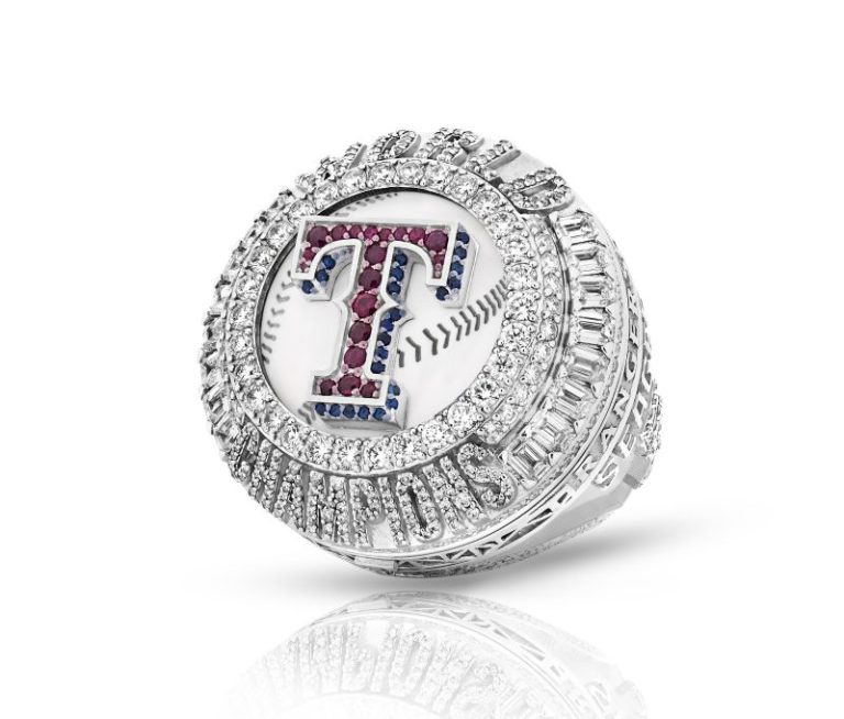 The face of each ring is removable and reversible. Each member of the Rangers had the option of the bedazzled ‘T’ logo with 49 points of rubies to represent the 49 players on the active roster against a white baseball background or to flip it for a sparkly blue background that features 103 sapphires to signify the season’s win total. The 23 red rubies around the ‘T’ commemorate the year the team won their first title and the 11 stones in the letter itself represent the 11 wins on the road that Texas captured en route to the World Series title.