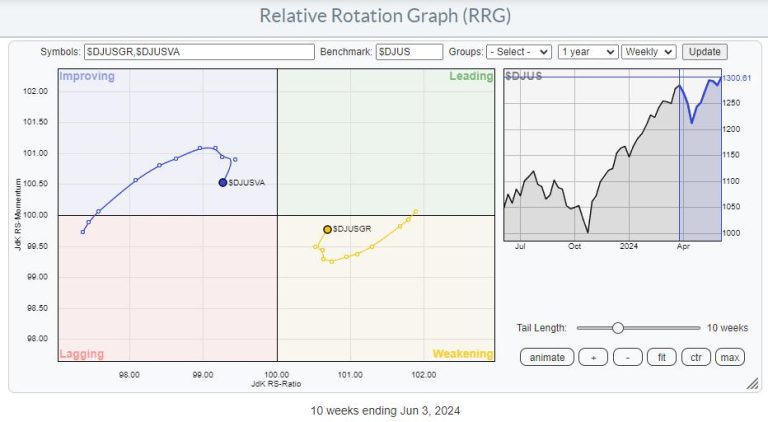 However, since mid-March, there has been a strong improvement for value stocks, which pushed the tail into the improving quadrant at a strong hanging. By default, the growth tail moved in the opposite direction into the weakening quadrant at a negative heading.