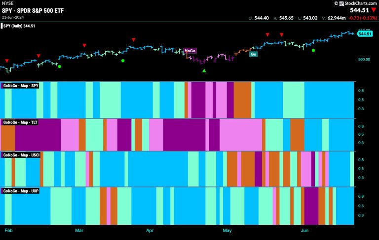Price hit another higher high this week as GoNoGo Trend painted a string of strong blue “Go” bars. When turning our attention to the oscillator panel we see that it has remained overbought this week moving between values of 5 and 6. Volume is heavy with prices at these levels. we will watch to see if the oscillator falls out of the overbought range in the upcoming days. If it does, we will see a Go Countertrend Correction Icon (red arrow) above price indicating that it may be a struggle for price to go higher in the short term.
