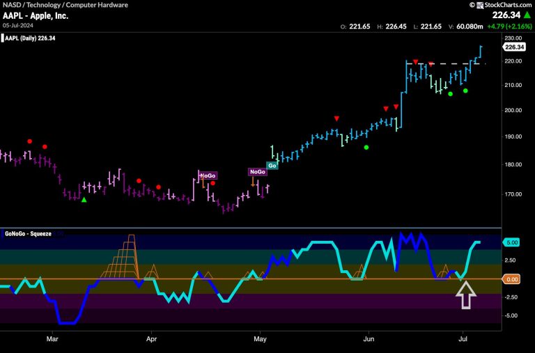 After a few weeks that now look like consolidation, we saw price hit new highs this week on strong blue “Go” bars. This comes after a few weaker aqua bars moved price sideways and GoNoGo Oscillator fell close to the zero level. It rallied quickly though and we are seeing strong momentum as price climbs.