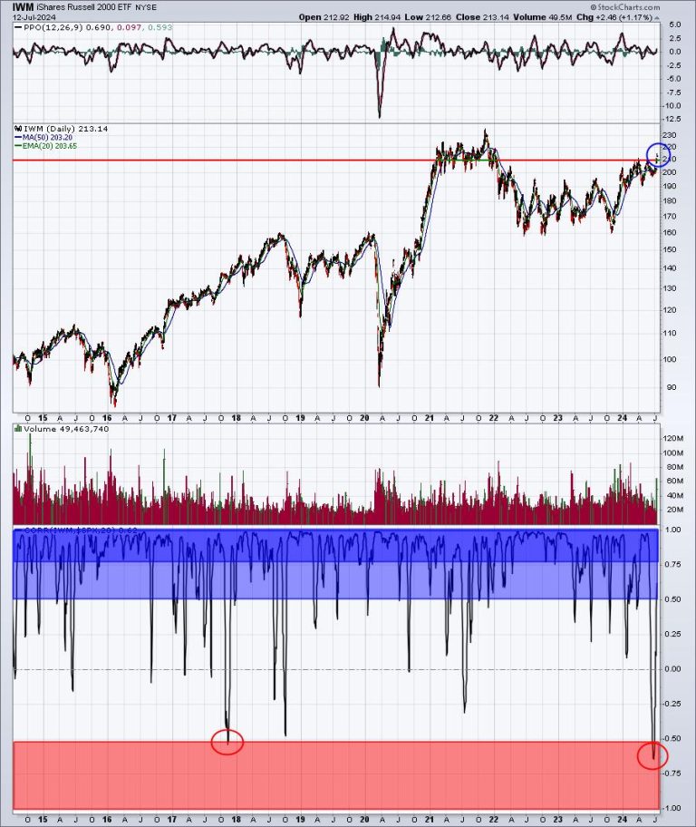 The really interesting part about small caps is that many traders don’t believe that they can perform well. They’ve underperformed for so long that short-term strength doesn’t feel sustainable. However, if you have long-term perspective, then you realize that recent weakness in the IWM is the outlier, not the norm. The bottom panel above shows the 10-year history of correlation between the S&P 500 and the Russell 2000. You can see that the overwhelming majority of time, the S&P 500 and the IWM move together directionally. The inverse correlation of late was the worst in the past 10 years. In fact, there’s only been one other time where inverse correlation has reached the -0.50 level and that was back in 2017. The norm is for the IWM to follow the S&P 500 higher during a secular bull market. The breakout last week is likely to see the IWM and S&P 500 correlation move back into that blue territory, particularly that dark blue territory that marks extreme positive correlation. Historically, the two spend much more time trending together.