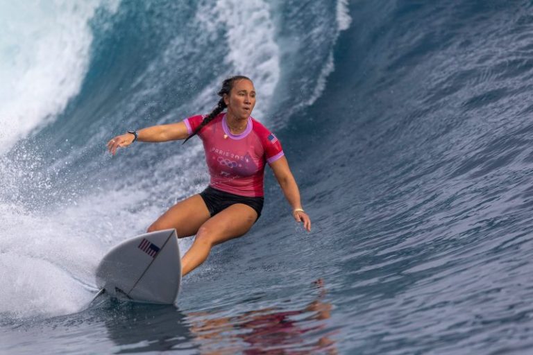 She took gold at Tokyo in the surfing’s Olympic debut and on Sunday looked to be in good form during her first-round heat on the legendary surf site in Teahupo’o. She had a combined, two-wave score of 16.5 as the American surged.