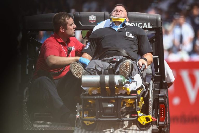 The home plate umpire in the New York Yankees vs. Colorado Rockies game on Sunday was carted off the field after he took a broken bat to the neck in a scary moment.