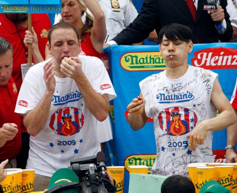 Both men dunked liberally at the Nathan’s Hot Dog Eating Contests. Of the five contests in which they both competed, Chestnut won three and Kobayashi won two.