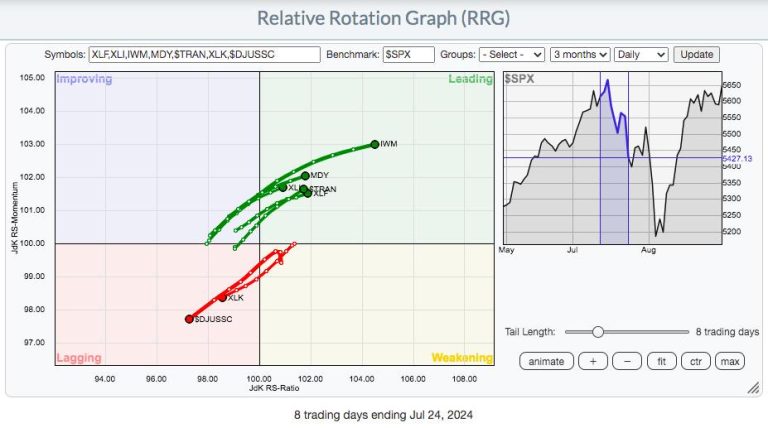 Financials (XLF), industrials (XLI), small caps (IWM), mid caps (MDY), and transports ($TRAN) were all poised to benefit from a change in Fed policy and the beginning of rate cuts. But Fed Chief Powell announced, and botched the announcement, in my opinion, with no rate cut and mentioning that a potential rate cut would be “on the table” for September. Now, I say “botched”, because the FOMC minutes came out two weeks later and the minutes suggested an upcoming rate cut was likely. “Likely” and “on the table” are not the same to me, but maybe others interpret it differently. Anyhow, that Fed announcement reversed the strength that we had seen in the groups mentioned earlier in July. Here’s how that RRG looked after the Fed announcement and leading up to Powell’s Jackson Hole address: