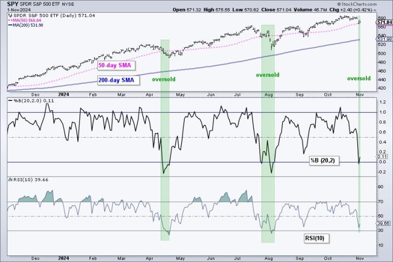 On the chart above, we can see %B becoming oversold in mid April, late July and last week (green shading). RSI became oversold in mid April and early August, but has yet to become oversold here in early November. On the price chart, notice that SPY is trading near its 50-day SMA (pink line). Prior dips below the 50-day SMA marked pullbacks within the bigger uptrend, not the start of a bigger trend change.