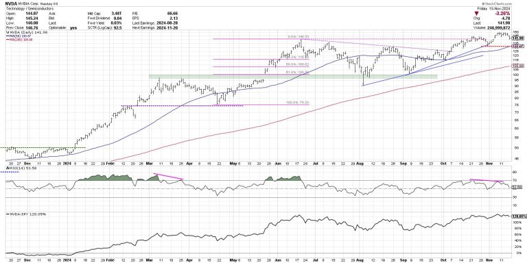 These three are in confirmed uptrends, as defined by Charles Dow’s original definition of higher highs and higher lows.  So the analysis here is simple: as long as that uptrend persists, the charts are in good shape.  For NVDA, that means a “line in the sand” around $132, which lines up with late October swing low as well as the 50-day moving average.