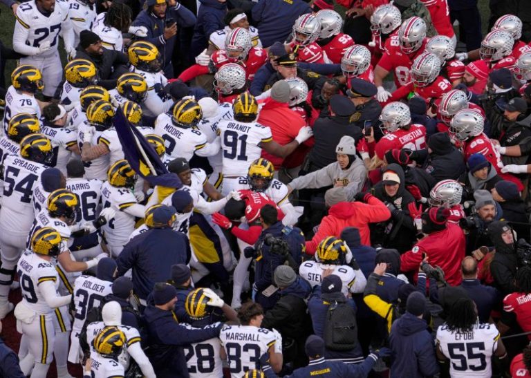 The brawl broke out when players from Michigan attempted to plant a flag on the Block O at midfield after defeating the Buckeyes 13-10. Ohio State’s players and coaches were gathered to sing ‘Carmen Ohio,’ a postgame tradition.