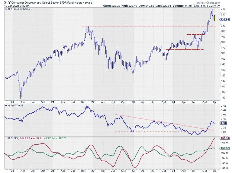 Consumer Discretionary remains well above its breakout level, which took out the peak of 2021. As a result, the sector has some room to decline — say, back to the support area around 210 — without harming the uptrend.