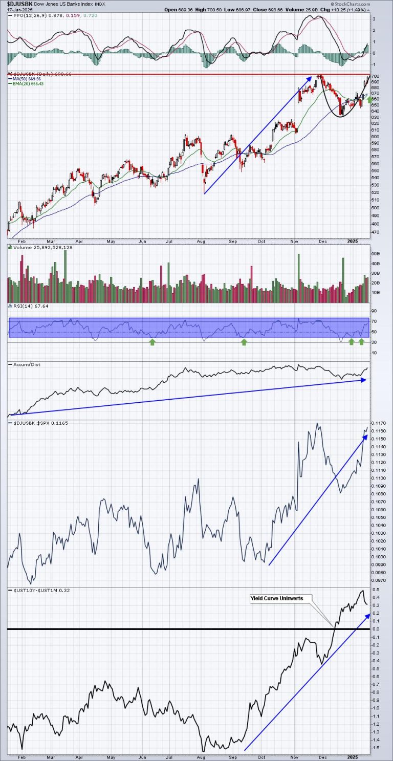 The most telling part of the story on this chart is told in the bottom 2 panels. Once the long-term yield began to turn higher vs. the short-term yield, banks began to significantly outperform the benchmark S&P 500 in anticipation of the strong earnings that you can see above the chart. And it just makes common sense as the net interest margin for banks can only go up with this type of interest rate environment. That’s the fundamental side, which is certainly important. However, more important are the charts, and this one remains in a very bullish pattern. Currently, we appear to have the right side of a potential cup forming. The PPO is coming off a centerline test and is gaining bullish price momentum. The AD line is back near its 52-week high. I see banks going higher from here, though we do need to see price break out above the high from late November to confirm. Our primary indicator, the combination of price action and volume, suggests trend continuation.
