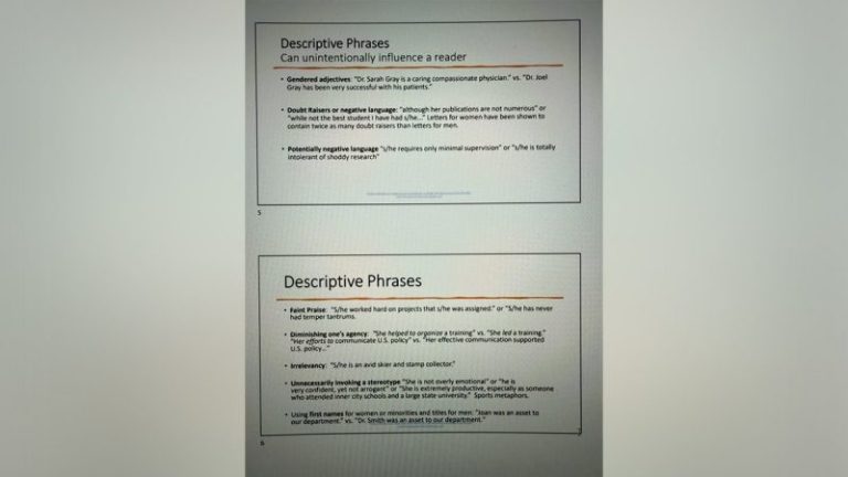 One of the slides gave descriptive phrases that can unintentionally influence a reader. It then gave examples of gendered adjectives like, ‘Dr. Sarah Gray is a caring compassionate physician’ vs. ‘Dr. Joel Gray has been very successful with his patients.’