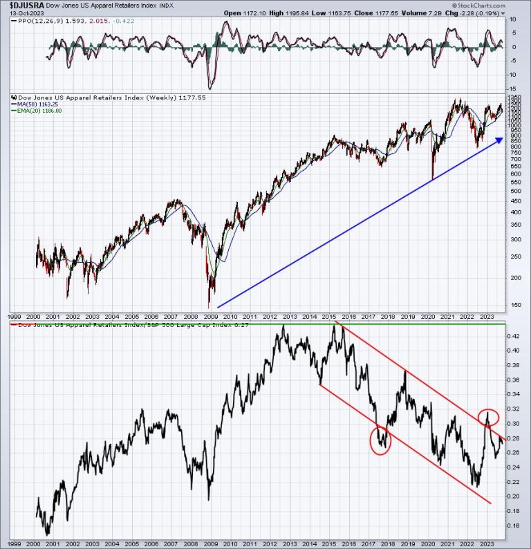 One example of an industry group that fails the test of time is apparel retailers ($DJUSRA). Yes, they’ll catch fire from time to time, but investing long-term in apparel retailers usually results in underperformance. Take one look at this long-term chart, especially the last decade, of the DJUSRA and you’ll see what I mean: