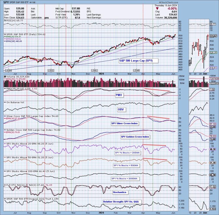 The Technology Sector (XLK) continues to dominate and drive the rally, but fewer and fewer stocks within the sector are participating in the rally. We know this because our Silver Cross Index (SCI), which shows the percent of stocks in the Technology Sector with Silver Cross BUY Signals (20-day EMA is above the 50-day EMA), is only at 54.60%. Almost half of the stocks are not on BUY Signals.