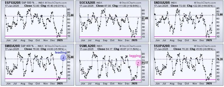 The CandleGlance charts above show the percentage of stocks above their 20-day SMAs for the S&P 500, S&P 100, Nasdaq 100, S&P MidCap 400, S&P SmallCap 600 and S&P 1500. We can identify the leaders and the laggards by comparing values. Mid-caps are leading as S&P MidCap 400 Percent Above 20-day SMA ($MIDA20R) surged to 76 percent (blue circle), the highest of the six. This means 76 percent of its component stocks are above their 20-day SMAs. This is a big change because this number was below 10% in mid December. Small-caps are lagging as $SMLA20R finished at 64.17 percent (pink circle). Everything else is in between.